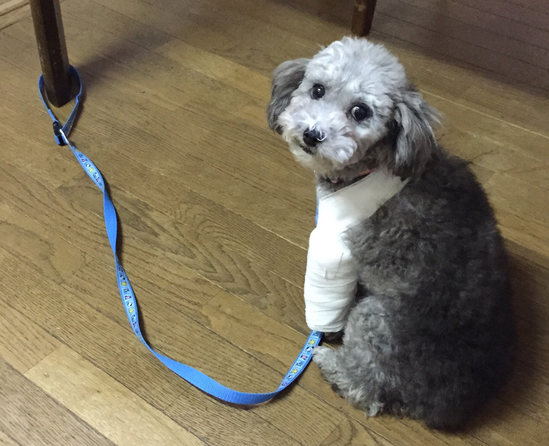 テーブルの足にリードで繋ぎ